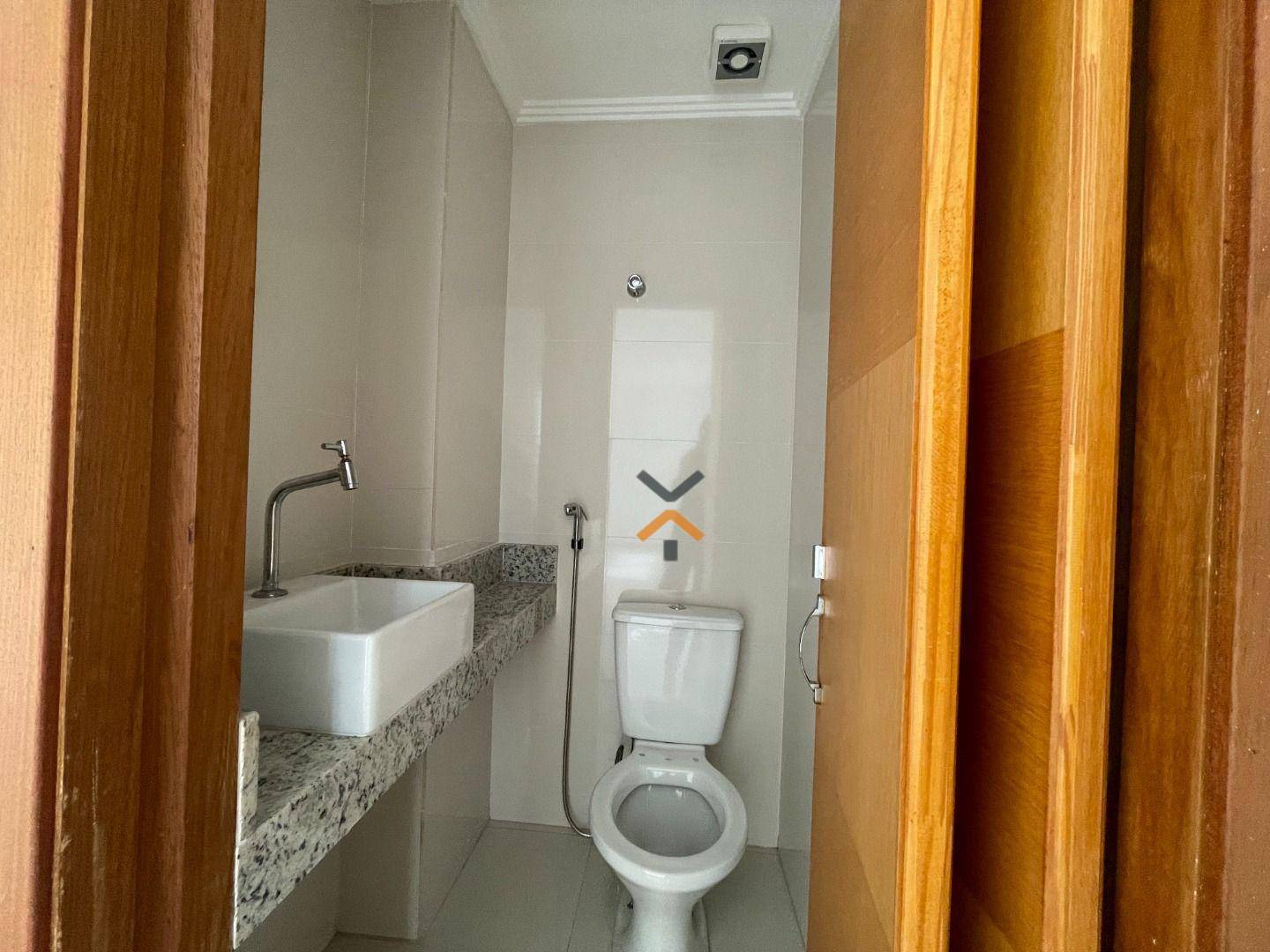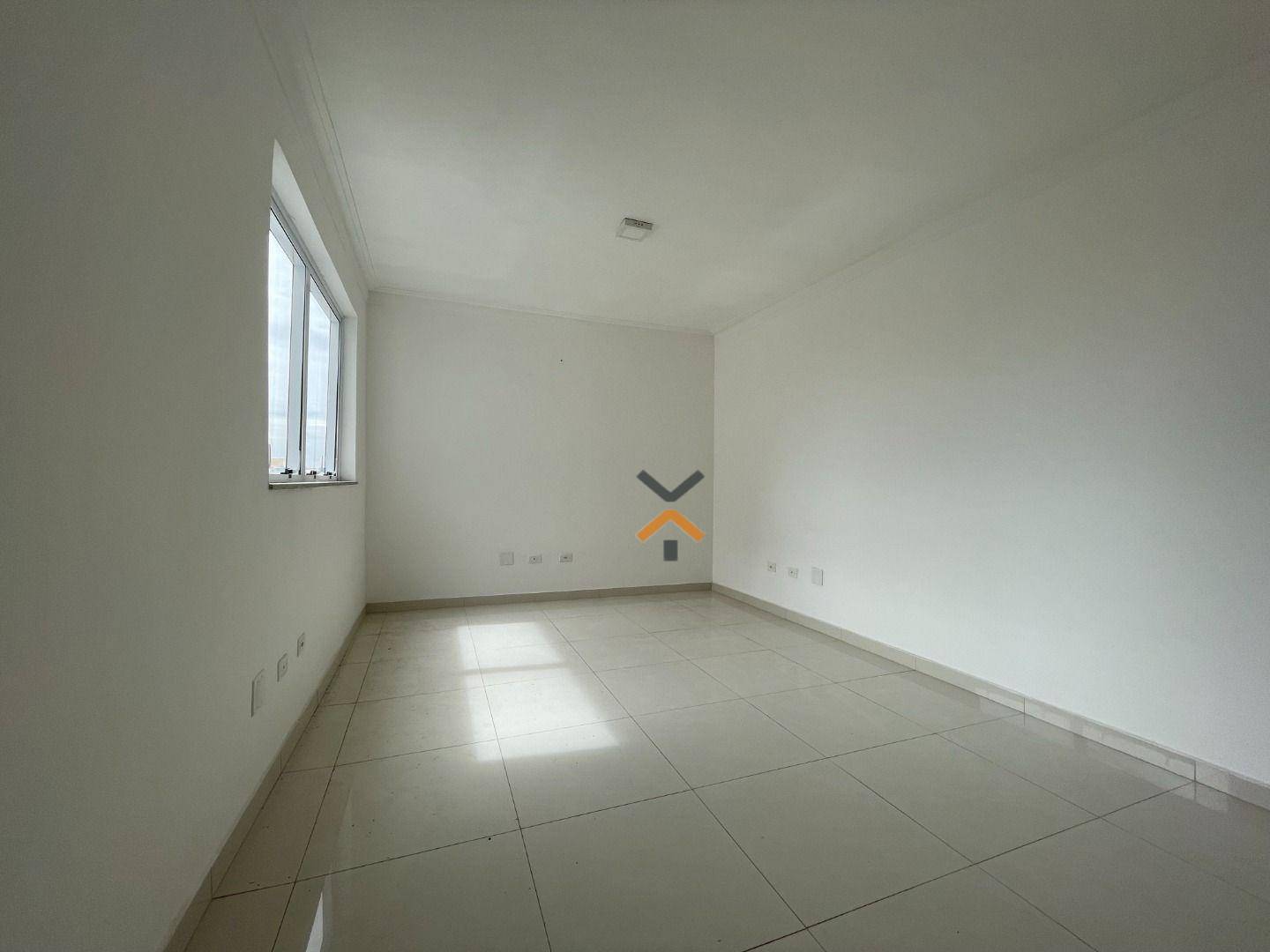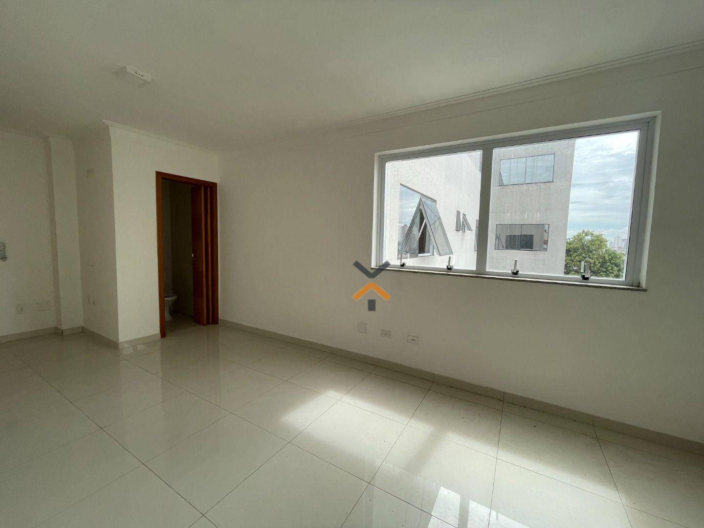 Sala comercial com 25 m², banheiro, divisória em vidro para uma pequena copa, sala com janelas amplas, bem ventilada, com iluminação natural, piso em porcelanato.