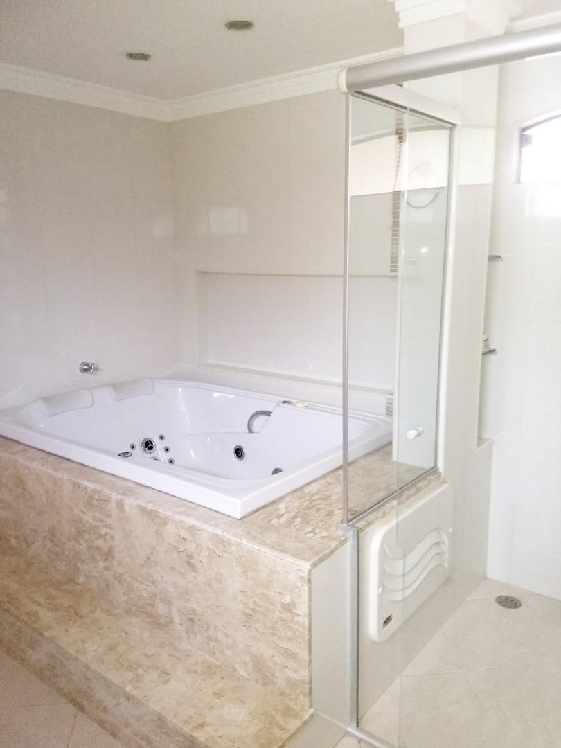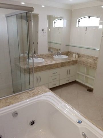 O acabamento é de primeira linha, com armários embutidos, piso laminado, piso e escadas em granito. Os banheiros têm piso e azulejos em porcelanato, cubas duplas e boxes de vidro.